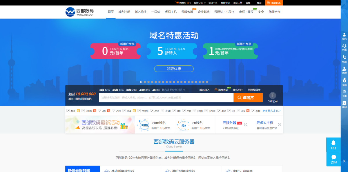 西部数码(west.cn)是一家经工信部审批,持有ISP、云牌照、IDC、CDN全业务资质的正规老牌云服务商。它成立于2002年,至今已有20多年的历史,专注于域名注册、虚拟主机、云服务器、企业邮箱、企业建站等互联网基础服务。