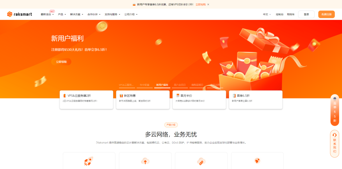 RAKsmart,成立于2012年的美国商家,由美籍华人创办,国内设分部,官网有中文页面和中文客服,工单可以直接中文提交。RAKsmart主打的是自营数据中心服务器、VPS以及服务器托管等业务,拥有国际BGP、大陆优化、精品网(CN2 GIA)三种线路可以选择。