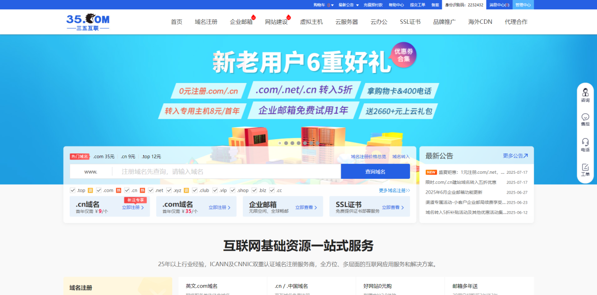 三五互联始创于1996年,国家高新技术企业,公司基于SaaS服务模式,沉淀20多年的互联网产品研发和服务经验,赢得国内外近百万企业客户的信赖与好评。推出域名注册、企业邮箱、网站建设、APP小程序开发、定制开发、虚拟主机、云服务器、办公自动化系统(OA)、邮洽、人脉云名片、35OKR、SSL安全证书、谷易搜等一系列产品。